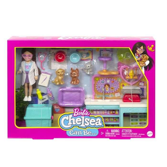 Şirin beyaz elbisesi ve önlüğüyle Chelsea güne başlamaya hazır. Steteskobuyla veteriner masasındaki "hastalarını" muayene edebilir ve hareketli tartıda kilolarını ölçebilir. Eğlenceyi zirveye çıkarmak için oyunlarınıza katabileceğiniz 4 evcil hayvan (2 yavru köpek, 1 yavru kedi ve hareketli salıncağıyla 1 kuş) dahildir. Ayrıca evcil hayvan yatağı, kedi evi, medikal cihazlar, pano, koni, pompalı biberon, ilaç şişesi, hayvan kutusu, mama kabı, ödül maması ve yara bandı gibi 18 parça daha bulunur.